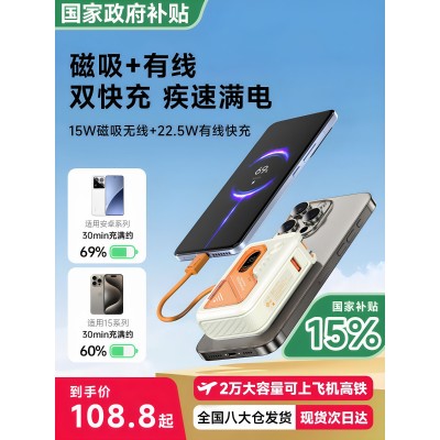 【充电宝3c认证可上飞机】充电宝20000毫安快充2025新款无线磁吸自带线插头适用苹果手机便携大容量移动电源